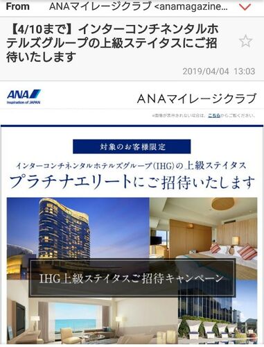 4月に入り、ANAから1通のメールが来ました。 インターコンチネンタルホテルグループ(IHG)の 上級ステータスにご招待との事です。 https://www.anaihghotels.co.jp/intercontinental/ 早速、手続き。 2週間~4週間ぐらいでプラチナエリートに アップ…